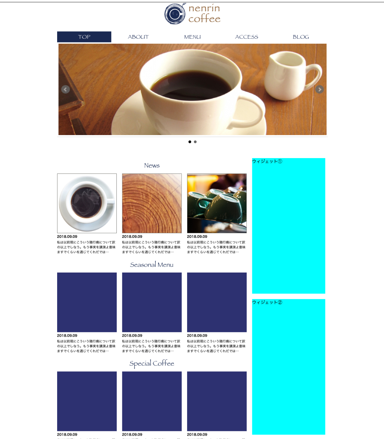 2018年Webデザインスクール時代の制作物 🏠えりんこ💻 OVERVIEW 2018年4月〜9月に通ってた職業訓練時代の制作物 YEAR 2018 すべてレスポンシブにはしたような(うろ覚え)TOPページのみ仮想企業サイト …先生が作ったデザインカンプをコーディング仮想カフェサイト…課題はOPEN時のポスターだったかな。ついでにサイトもデザインして制作。