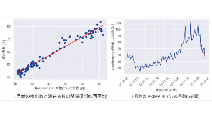 オープンキャンパスの出し物として食堂内の混雑度を推定・予測するアプリを開発しました。iPhoneなどの端末から発せられるBluetooth信号から食堂内に何人が入店しているかを推定しています。Bluetooth信号を発する端末数には個人差があるため、実際の人数とずれないように統計的に推定しています。
