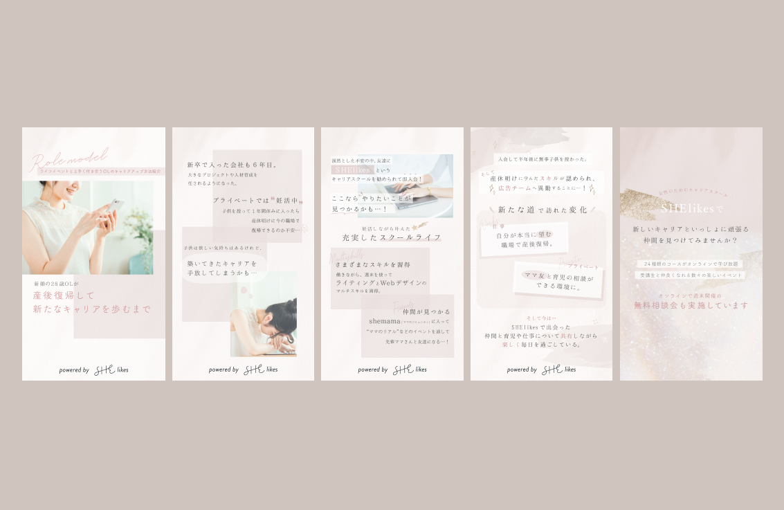 MERYとSHEのコラボとしてInstagramストーリーズにおいて MERY読者・フォロワーに対して、好きをベースにした「自分らしい」仕事やキャリアについて考えるきっかけを提供するバナーを作成しました。テーマは「わたしにもなれそうなロールモデル」です。(2021年8月制作)
