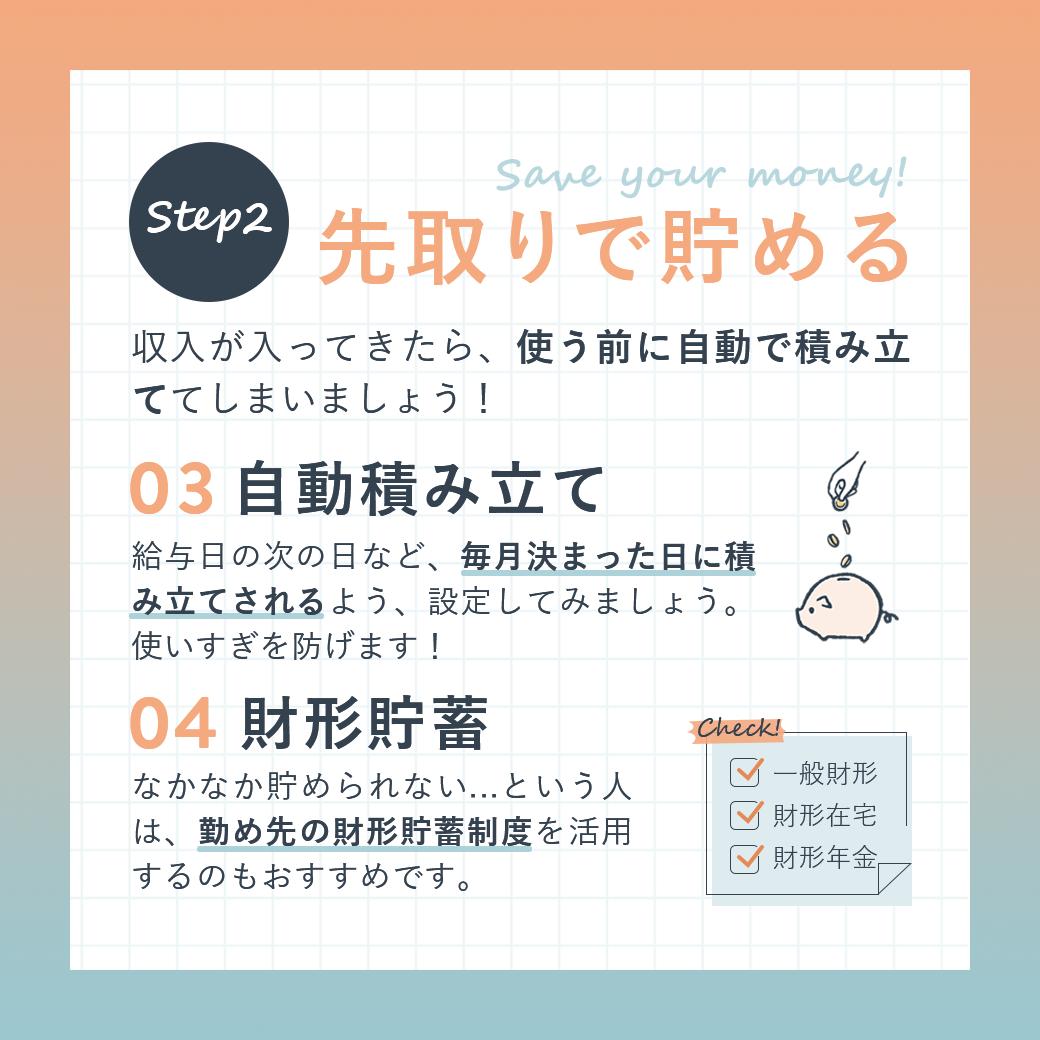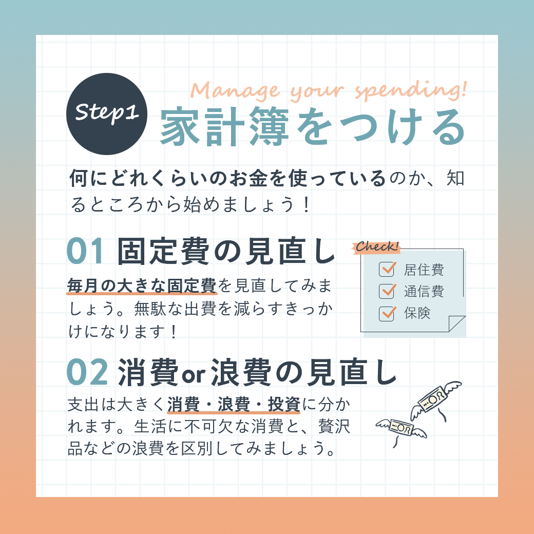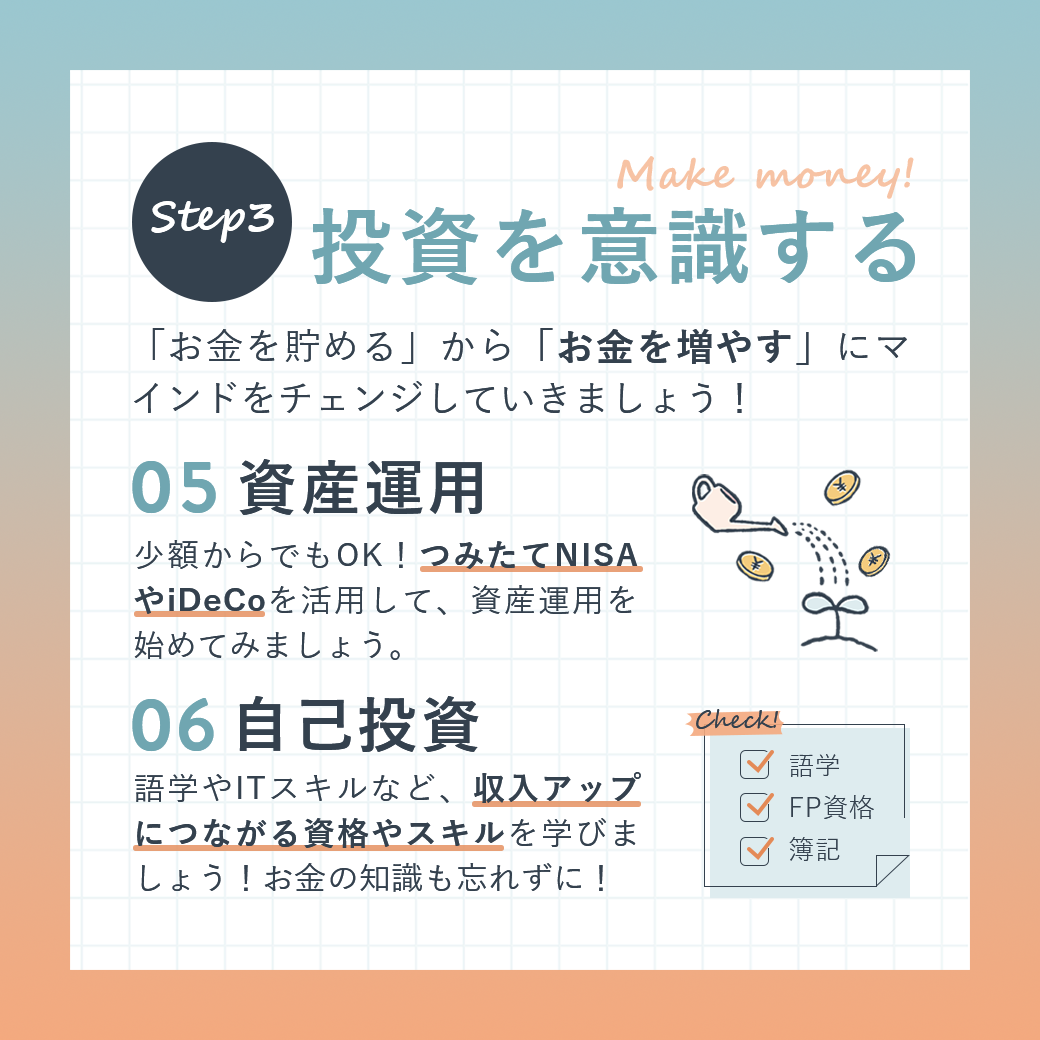 「お金の不安を解消する方法」というテーマで、お金の知識に自信がない方でもすぐに始められるTippsを、見直し→貯蓄→投資の3ステップに分けてそれぞれ2つずつ紹介するバナーを制作しました。