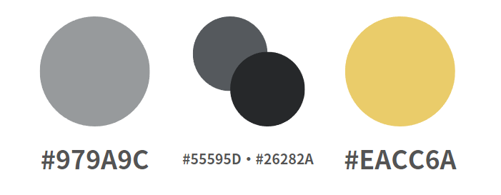 ベースカラー(#979A9C):メインカラー(#55595D・#26282A):アクセントカラー(#EACC6A)