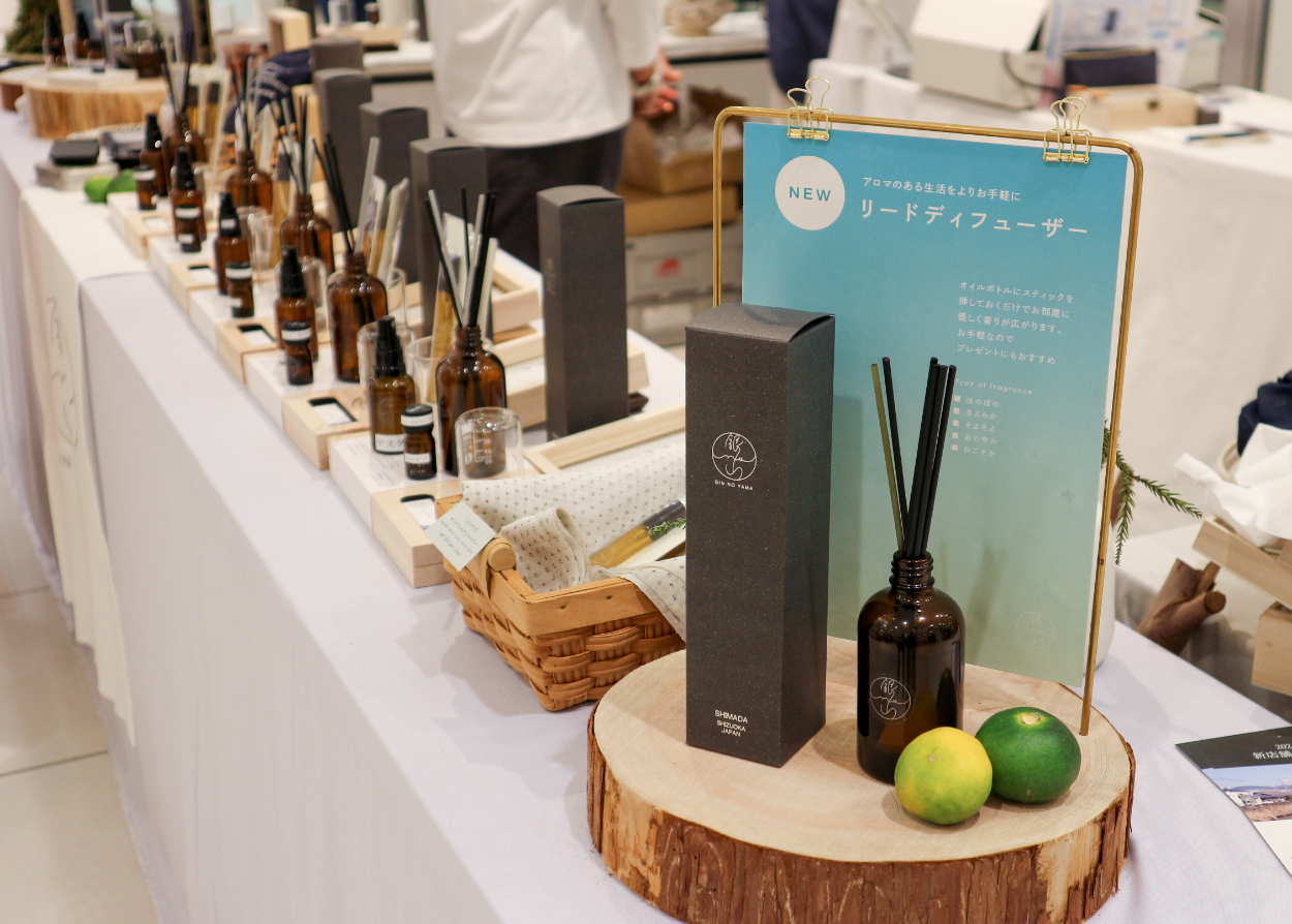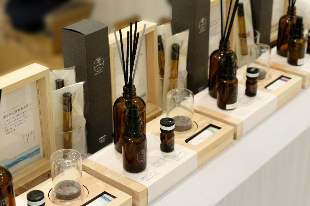 様々な展開のあるアロマ商品を香り別にわかりやすく展示すること、ムエットやストーンディフューザー(今回は清水瓦で作りました!)の手に取りやすさ、乱雑にならない工夫をよく吟味して、銀の山の智子さんと、落合製材所の落合さんと作らせていただきました。