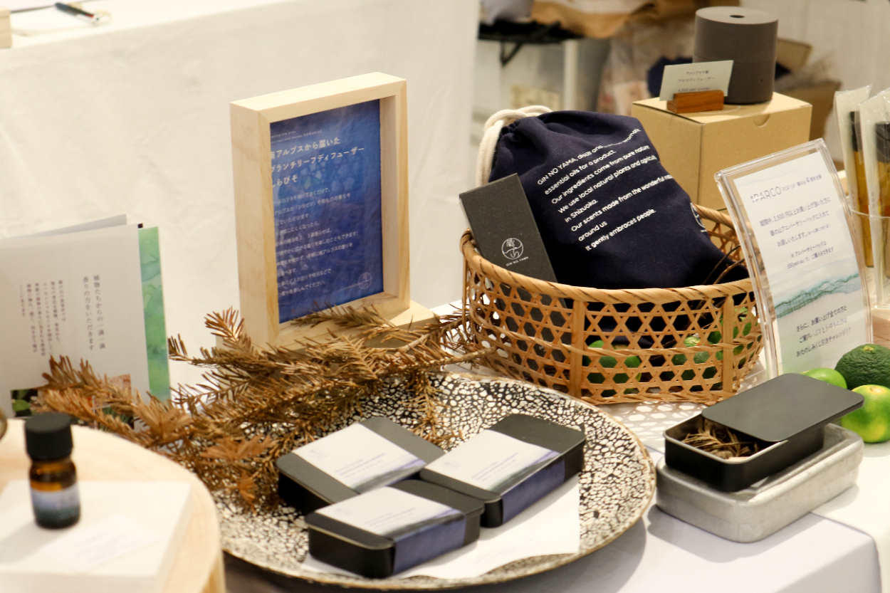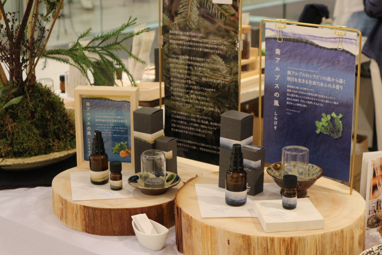 また、今回目立たせたかったメイン商品のしらびそを使用したアロマの什器には、丸太を使用したり、南アルプスの森林をイメージした生花の演出をしたりしました。