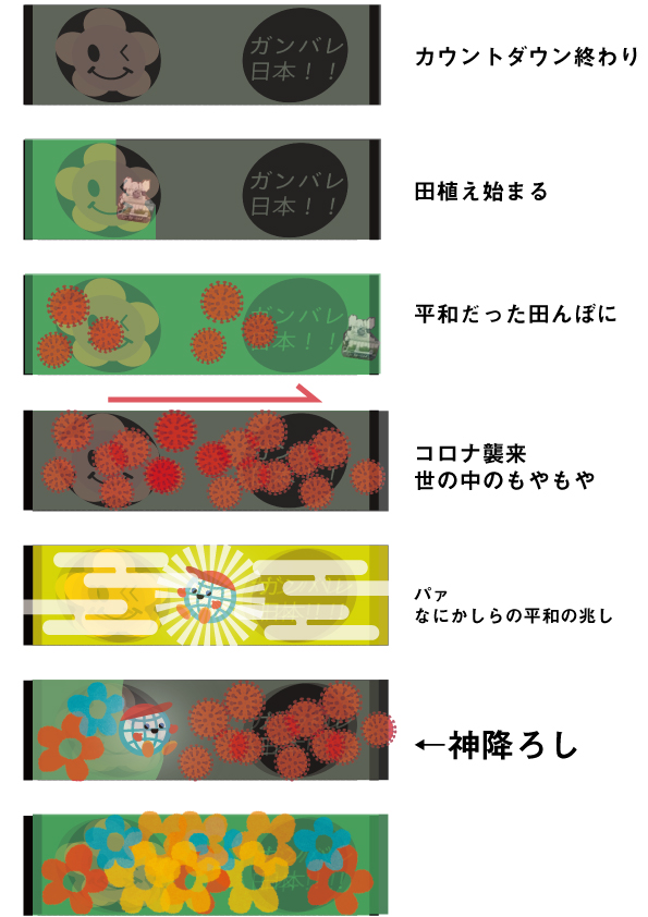 ”コロナ”によって暗くなってしまった世の中を具体的に再現すると、次の動画から繋がりの違和感が出てしまうのと、「ガンバレ日本!!」のメッセージをコロナに限定して受けっとってほしくなかったので、暗くなっていくシーンは、わざと抽象的に再現しました。