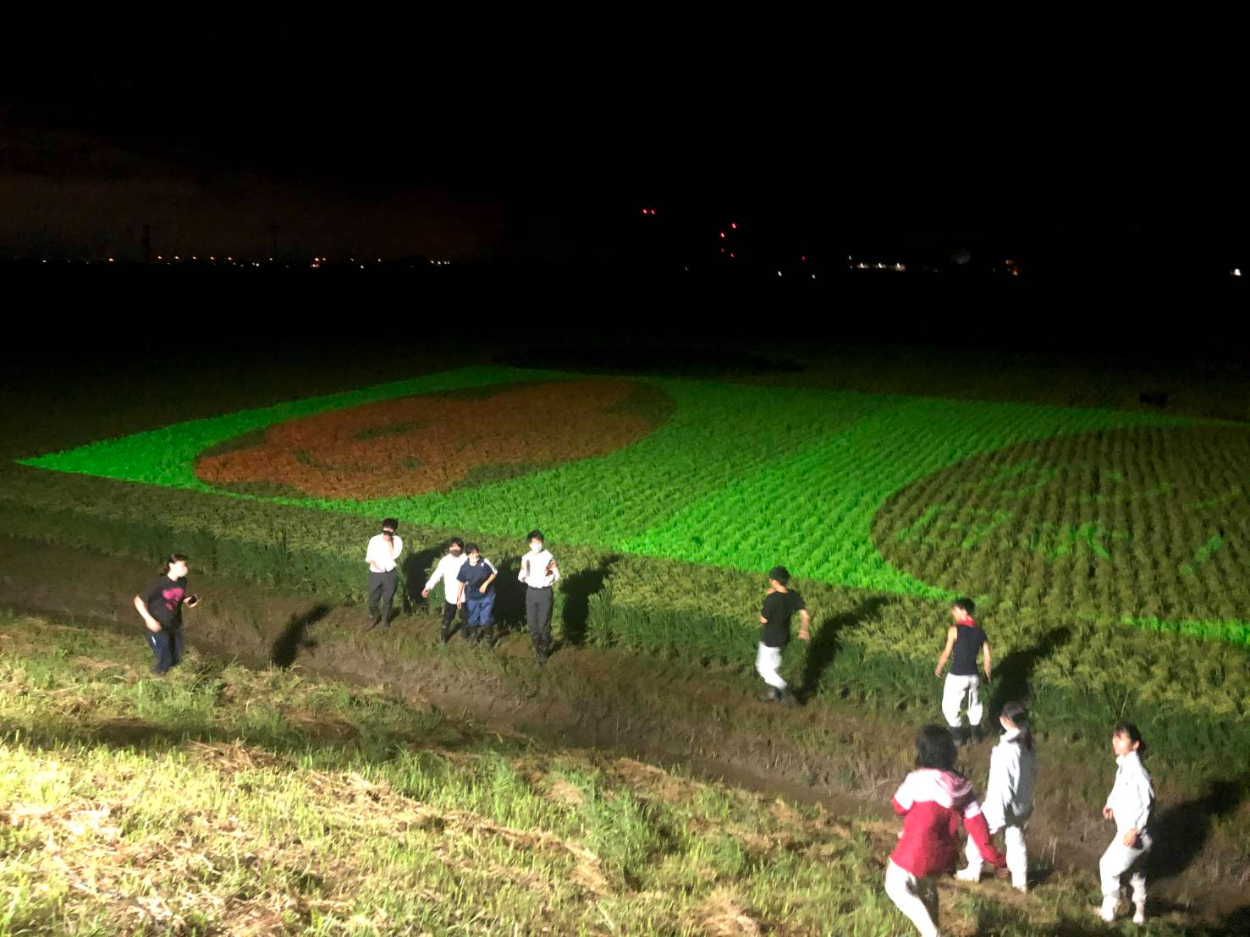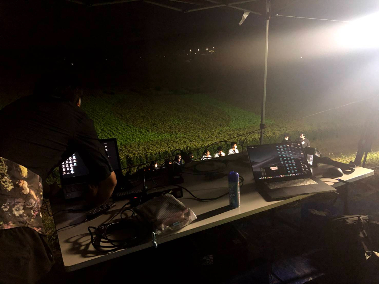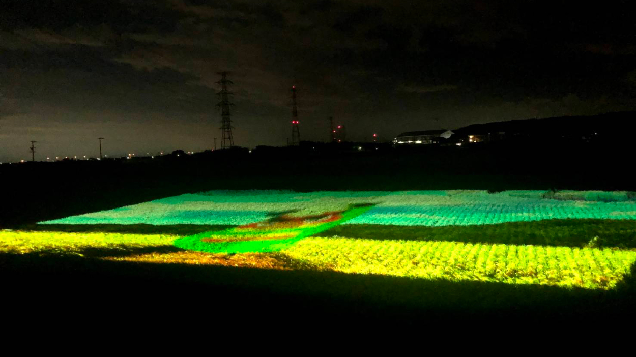 実際の田んぼに投影してみると、各シーンの繋ぎでぶつ切り感があったり、全体的なバラつきが明るみになり、修正点を洗い出す。