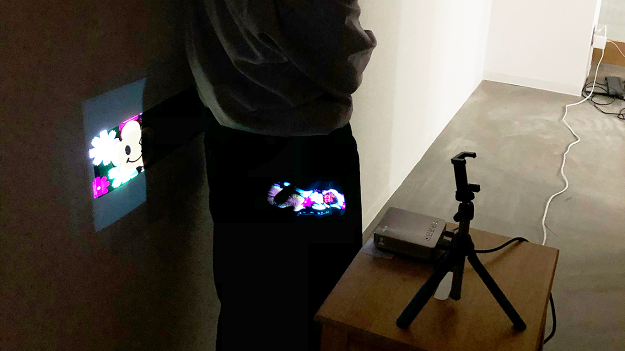 プロジェクターで動画を投影し、各シーンの出来栄え、流れ、色味などの確認。白が一番はっきりみえることが判明したので、白の部分を少し多めにしてみました。