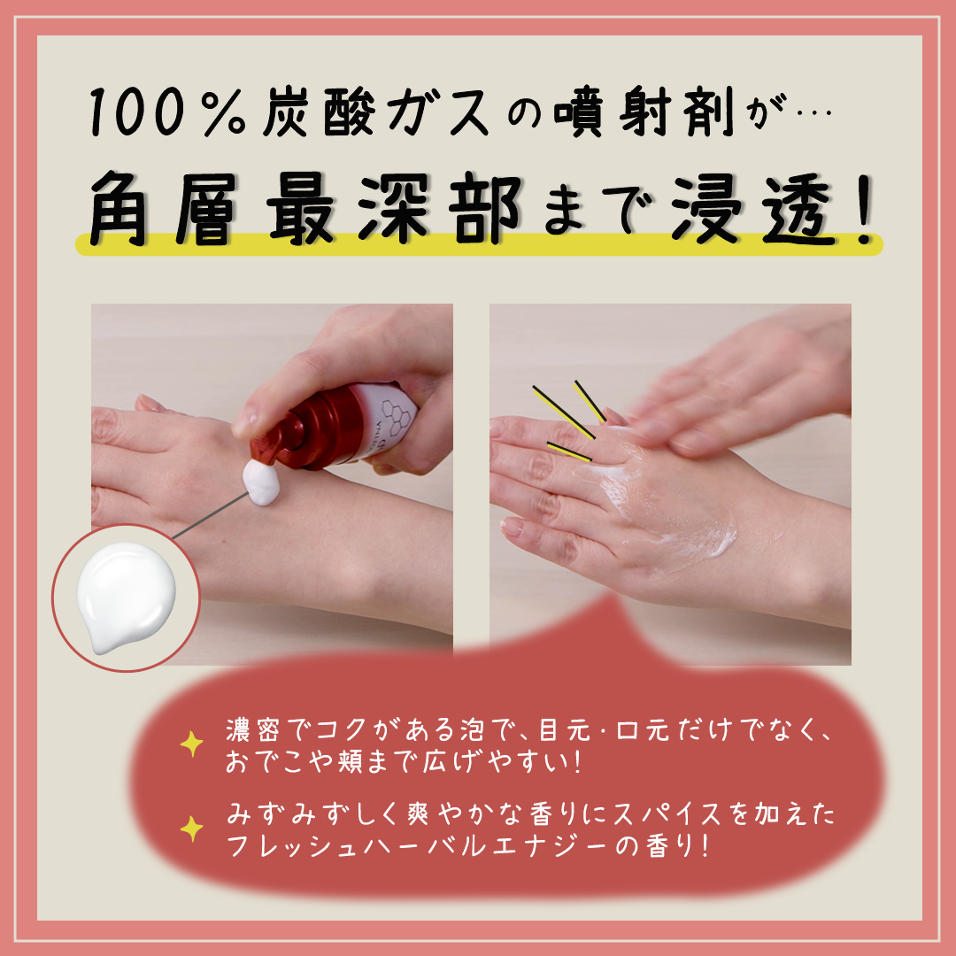 - 特徴:毛穴より小さい炭酸 *泡 *炭酸ガス(噴射剤)*
