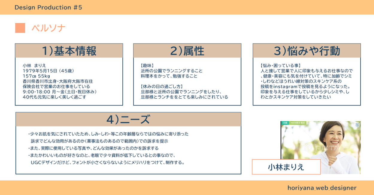 今回はターゲットの年齢層が幅広いため、中間の40代女性をペルソナ設計を行った。