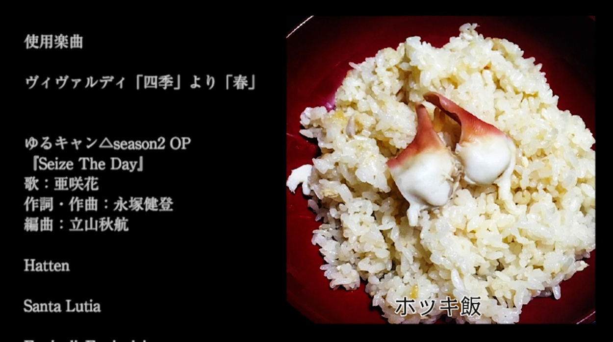 この部分はafter effectsで作成しました。BGMは「ゆるキャン△second season」のOPを使用、間奏の時間のタイミングに合わせました。滑らかに文字や写真がスライドがいいタイミングで入ったと思います。タイトルは「MOKO'Sキッチン」のパロディです。