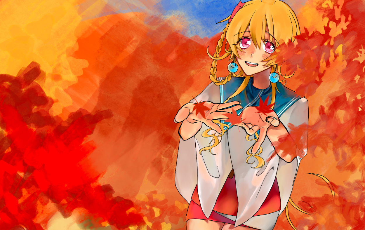 紅葉の時期に描いたイラストです。ポーズの遠近感や、厚塗り表現を模索しました。