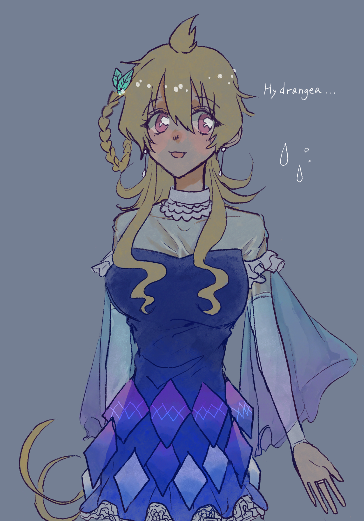 趣味で運用しているVTuberのキャラクターにあじさいイメージの衣装をデザインして着せたコンセプトのイラストです。色合いやデザインがとても気に入っている一枚です。