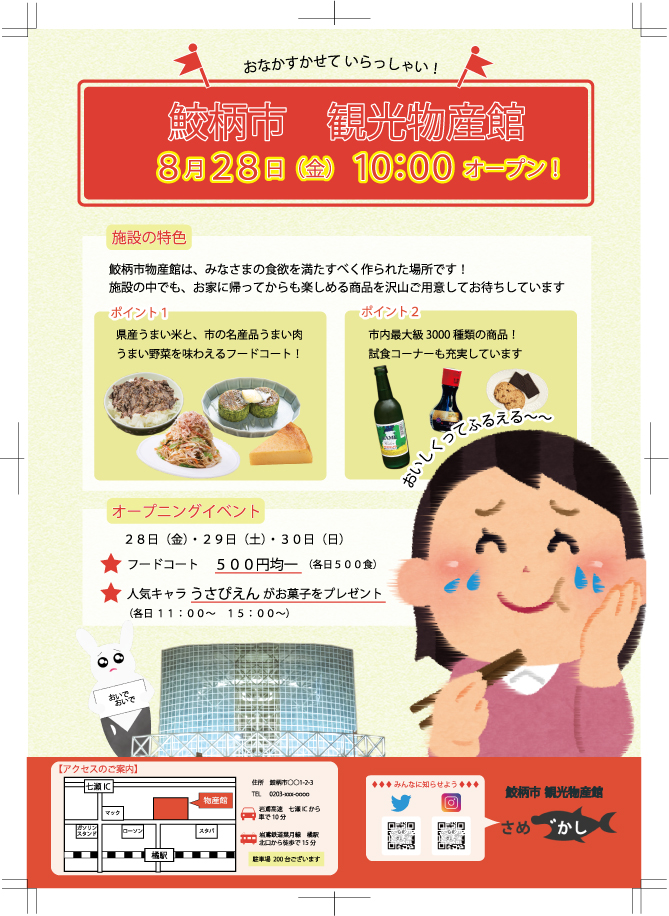 職業訓練の課題で、架空都市(さめづか市)の観光物産館オープニング告知のためのチラシを制作しました。(ラフ書き起こし〜制作)