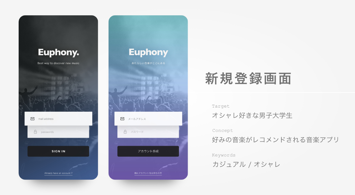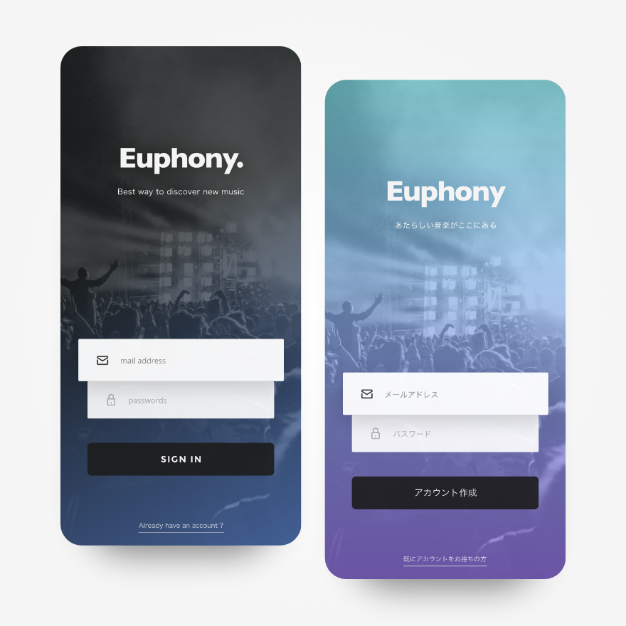 音楽ストリーミング配信アプリ|UI design うたたね Art Director, UX UI Designer OVERVIEW 好みの音楽がレコメンドされる音楽アプリの新規登録画面を制作 YEAR 2019 もしご興味がありましたらお気軽にお声がけくださいtwitter @utataneclub