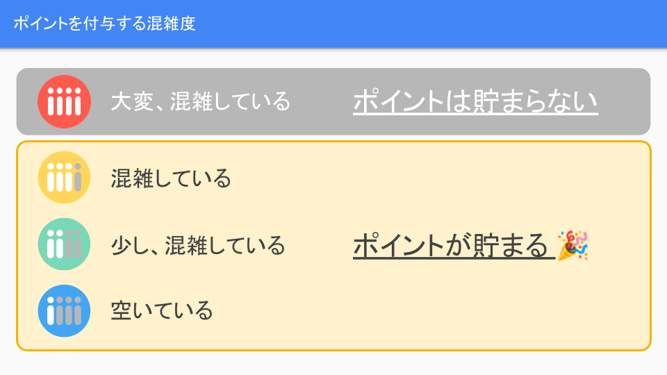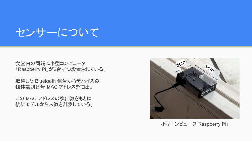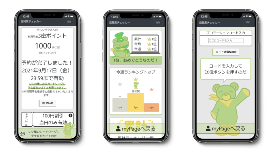 オープンキャンパスの出し物として食堂内の混雑度を推定・予測するアプリを開発しました。3密ポイントはこの混雑度を基に混雑していない場合に食堂で使えるポイントを配布しています。iPhoneなどの端末から発せられるBluetooth信号から食堂内に何人が入店しているかを推定しています。Bluetooth信号を発する端末数には個人差があるため、実際の人数とずれないように統計的に推定しています。