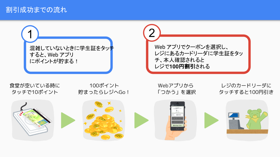 この問題を解決するための仕組みとして、食堂が空いている時にカードリーダに学生証をタッチするとポイントが貯まるWebサービスを開発しました。1回につき10ポイント(10円分)で100ポイント貯まると食堂で100円引きされるシステムです。予算は、教授に熱意を伝え、学長裁量経費から捻出していただきました。本大学で初めて学部1・2年生(全24名)が自主的に大学で大規模に使われるシステムを作る前例を作りました。