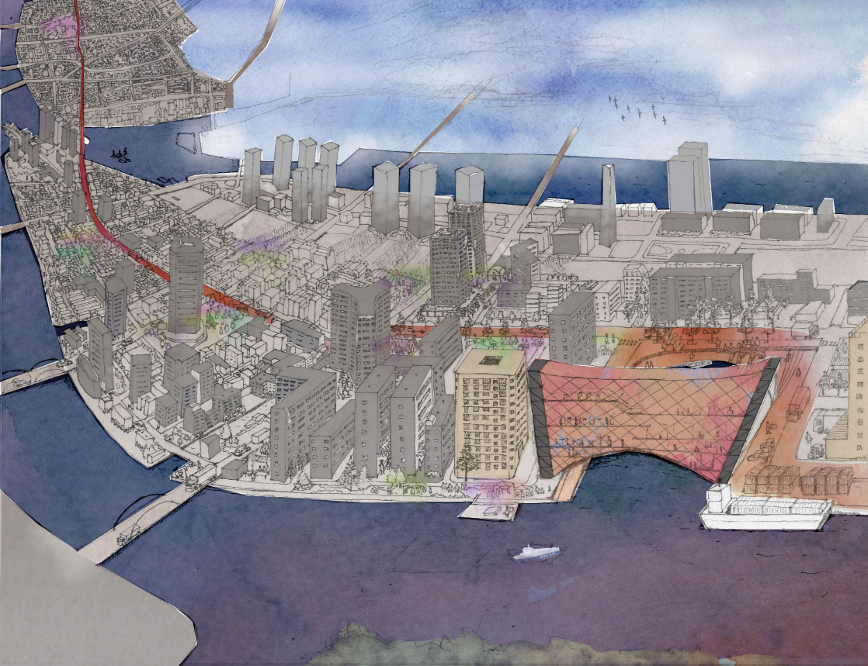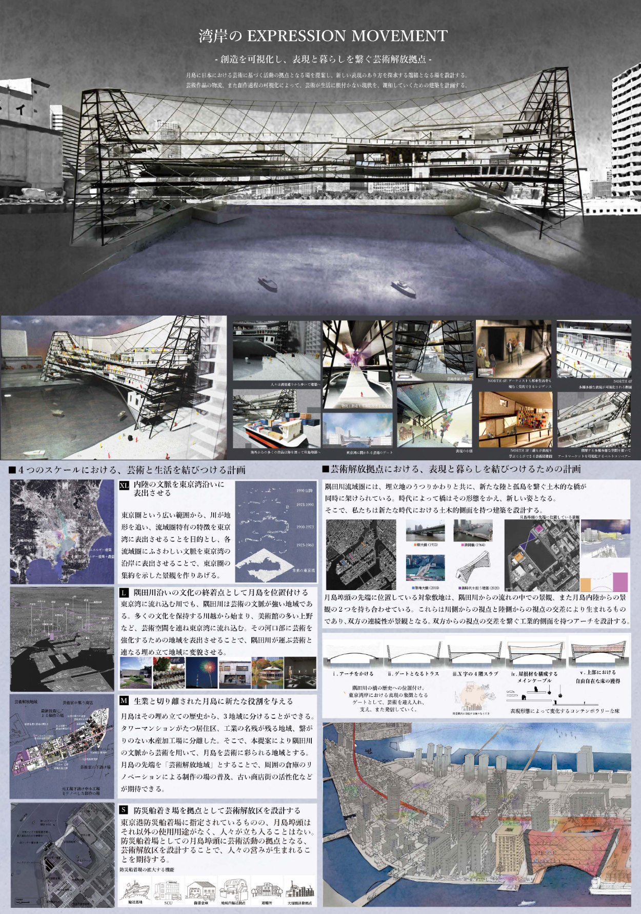 本計画では東京の芸術文化の結節点となる月島に日本における芸術に基づくあらゆる活動の拠点となる場を提案し、日本における新しい表現のあり方を探求する端緒となる場を設計する。
