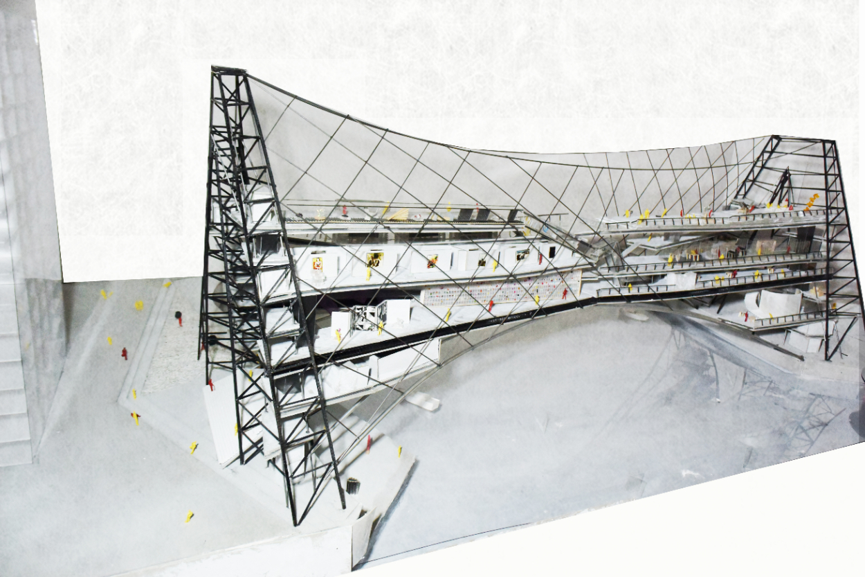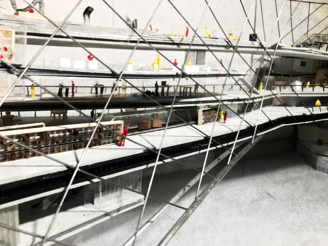 断面的には東京湾岸を背景に、多種多様な創作行為、表現が重なっていき、その積層をベルトコンベアーで貫くことでアートマーケットを可視化して繋ぐ。