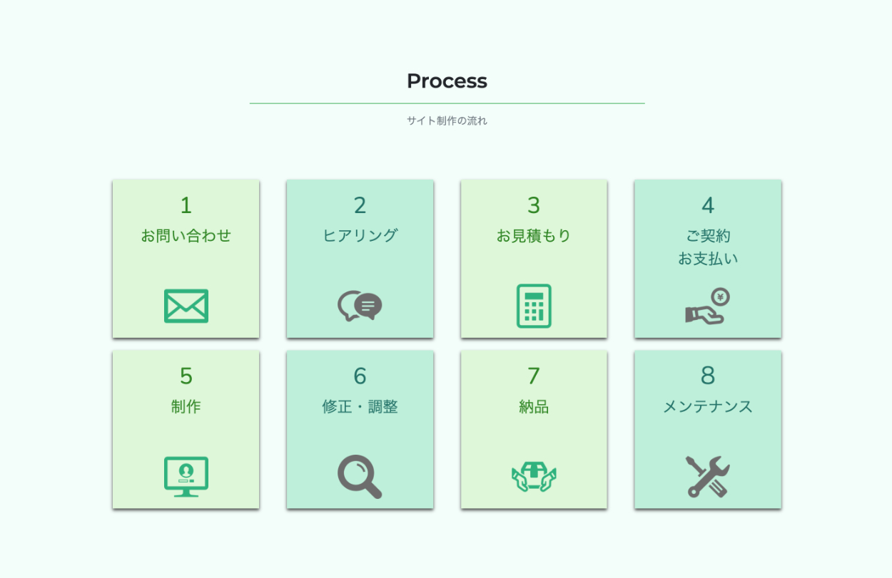 「数字」・「内容」・「アイコン」を使用することで瞬時にサイト制作の流れをイメージできるようにしました。