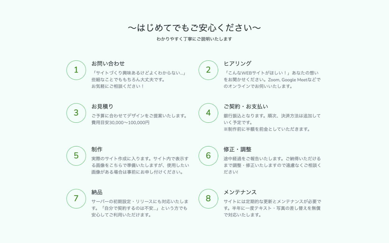 サイト制作の流れ(イメージ)で使用した数字を再度使うことでイメージと補足文章を紐づけられるようにしました。また文章は読む負担がかからないように3行に収めるようにしました。