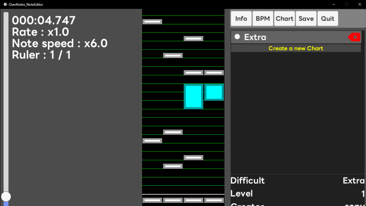 音楽ファイルはいいものの、曲情報、BPM、難易度ごとの譜面をすべて手打ちで作るのは流石に大変なので、エディタを作ることにしました。