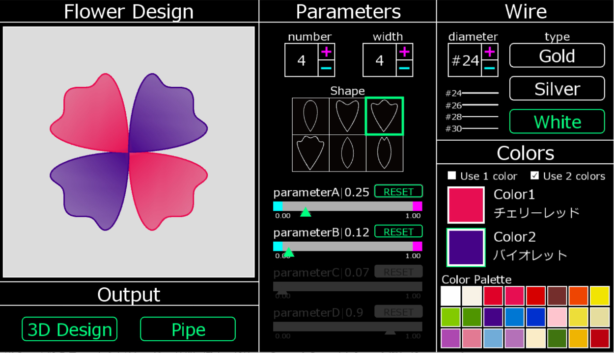 初心者でもオリジナルデザインのディップフラワーを簡単に制作できるようにすることを目的とし、デザイン支援として「直感的な操作で簡単にオリジナルデザインを作れる支援システム」と、制作支援として「花びら型のパイプを使用する制作手法」を提案した。