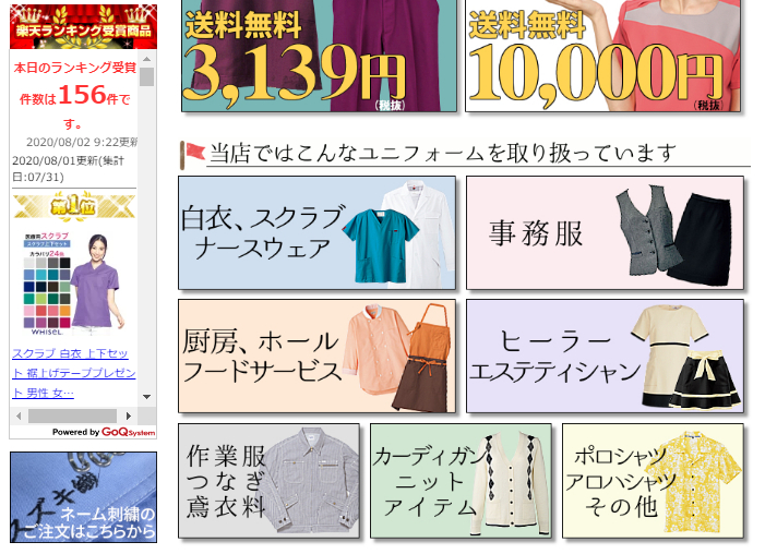 ベースのファーストビューの下には、取扱商品のカテゴリ分けを入れてあります。白衣、スクラブ以外のアイテムも販売していることを来客に案内し、誘導する目的です。