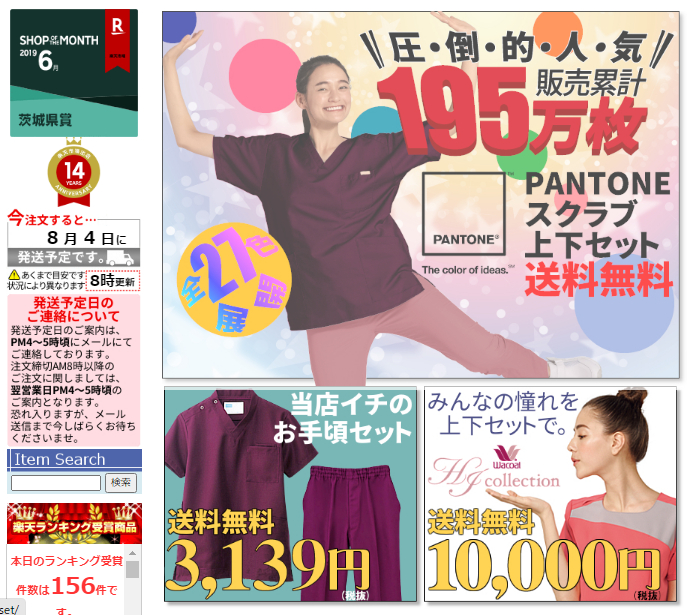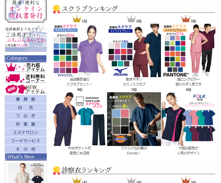 さらに下部に進むと買い物に悩んでいる方に人気の商品を案内するランキングを掲載しています。スクラブ以外に、診察衣、ナースシューズ、事務服など検索されやすいアイテムをランキングで紹介しています。