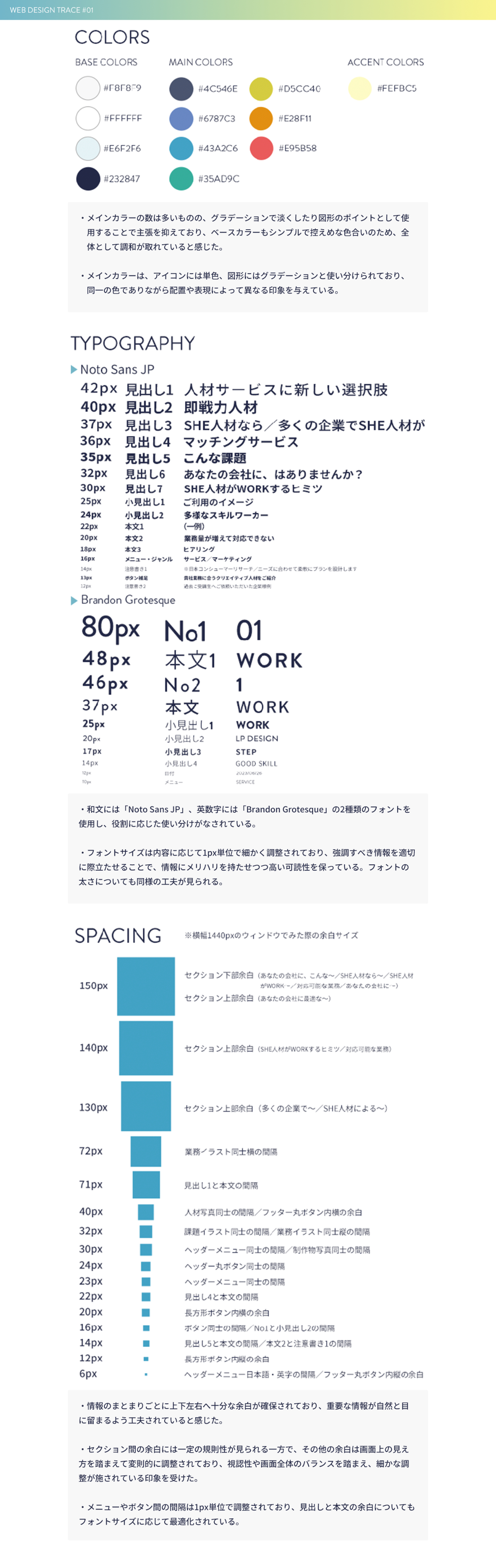 実案件を想定したデザイン短期集中型プログラム「SHElikes PRO デザイナー」にて、3つ目の課題としてLPトレースに取り組みました。 配色・フォント・余白の使い方についてスタイルガイドにまとめました。併せて、PCとSPのレイアウトの違いや要件について分析を行いました。