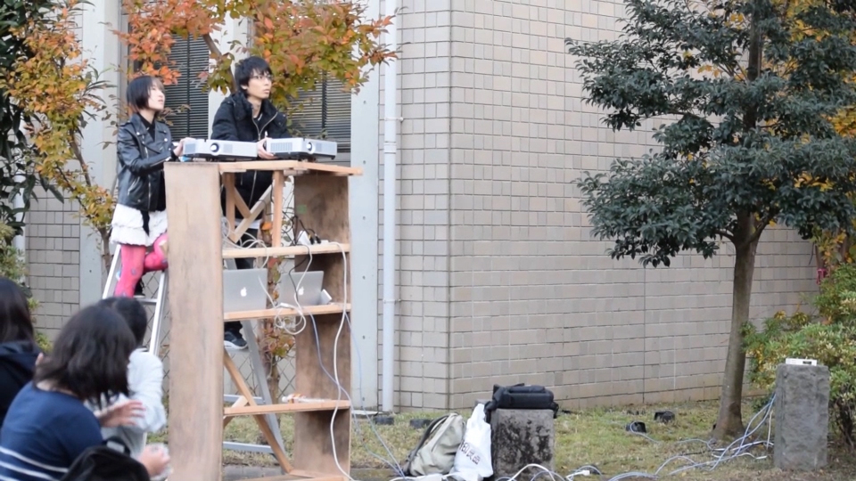 作品は中庭を囲う建物と床に計10 台のプロジェクターを使うことで実現しており、映像と音楽の同時再生のためのパソコンの同期は私がopenFrameworksを使いOSCという通信規格で有線で行った。