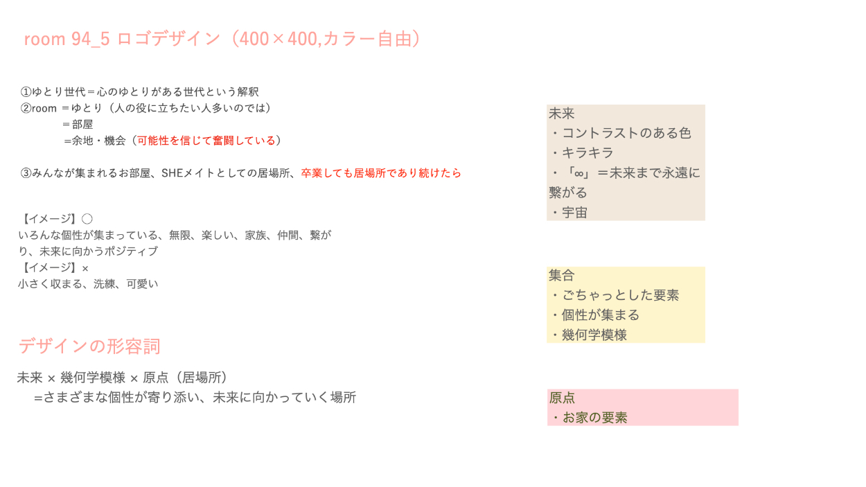 考案者の言葉を自分なりの解釈もして、デザインに落とし込みやすいように言語化しています。この段階でロゴのイメージは「未来×幾何学模様×原点」というキーワードを導き、テーマを「さまざまな個性が寄り添い、未来に向かっていく場所」としました。