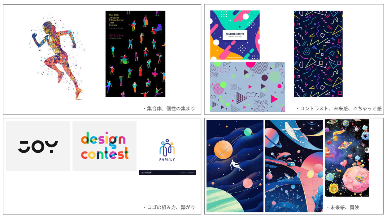 言語化したアイデアをより具体的に画像やイラストを集めて、イメージしやすいにしています。今回は、上記で定めたキーワードやテーマから、「幾何学模様が集まった、コントラストやカラフルさを感じるロゴ」を軸に制作することにしました。