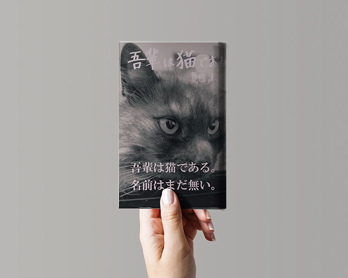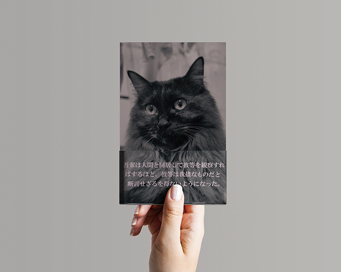 著作権切れの小説が読めるサイト「青空文庫」に掲載されている小説の中から一つを選び、書店で目を惹く文庫本の装幀デザインをしました。私は「吾輩は猫である」を選びました。今までの近代小説の装幀デザインらしくないものを考えて制作するよう心掛けました。ポイントは、何かをまっすぐ見つめている猫の写真をモノクロにしたことと、題名(吾輩は猫である)と著者名を手書きにしたことです。帯には、本文で印象に残ったフレーズを選び、配置しました。