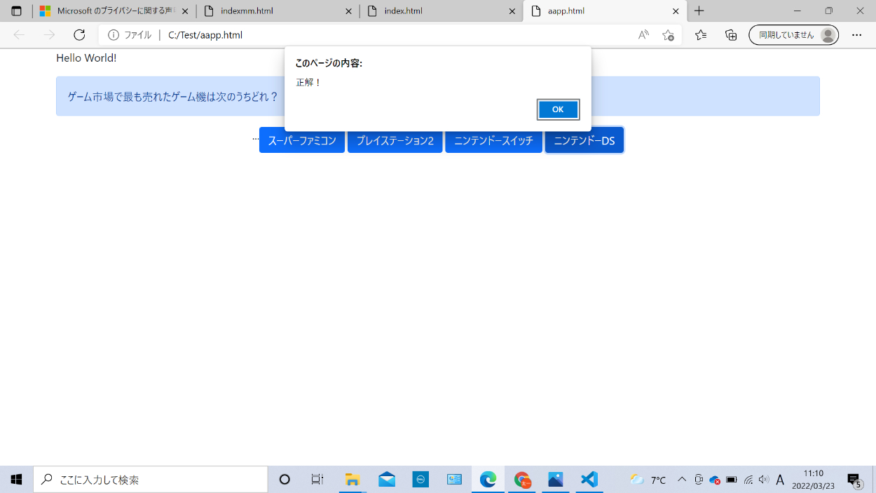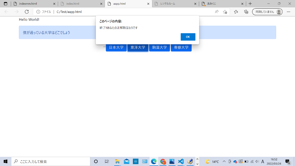 問題は全部で三問あり、全部の問題を答えると正解数を表示します。