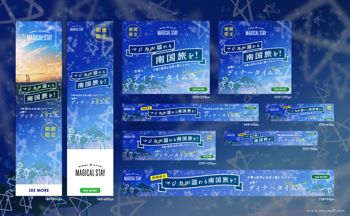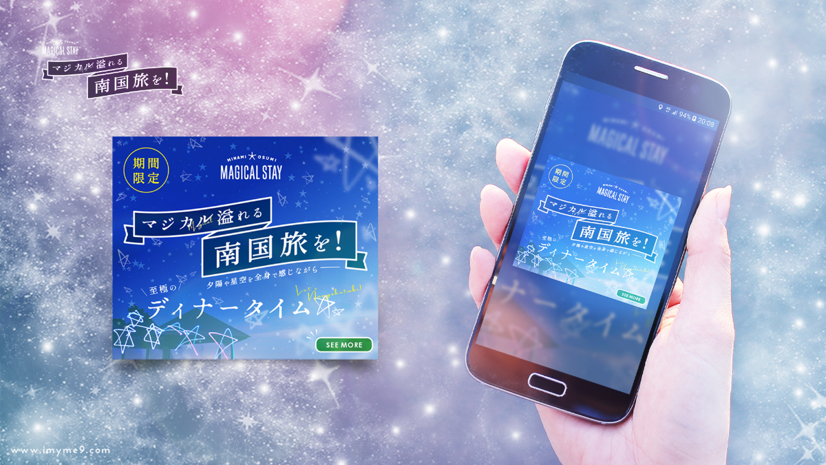 「マジカル溢れる南国旅を。」の合言葉で南大隅町への旅行サイトを運営する「MAGICAL STAY」のサイトへの訴求バナーを制作しました。