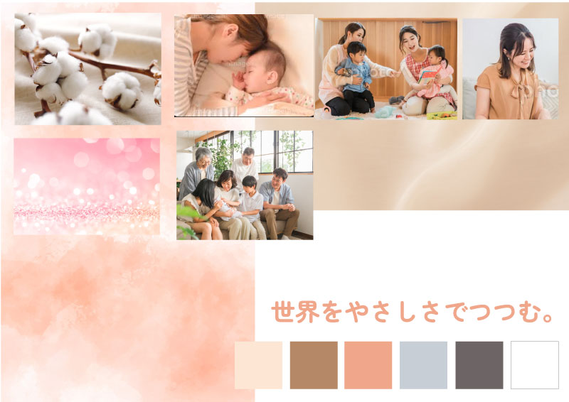 「世界をやさしさでつつむ。」から想起したやわらかさ、綿のイメージ、赤ちゃんや家族の理想の形としてのあたたかさ。