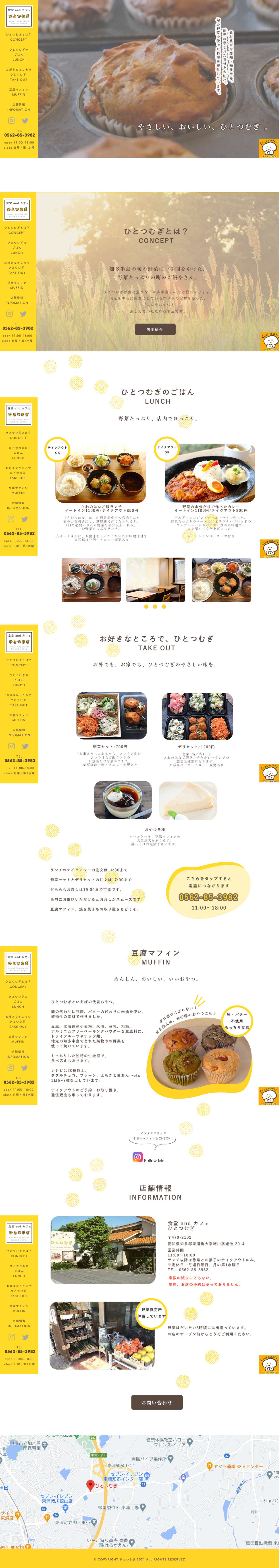 Webデザインコースの卒業制作として、地元の野菜を使ったランチと体にやさしいおやつを提供する実在の食堂&カフェ「ひとつむぎ」様をモデルにHPを制作いたしました。