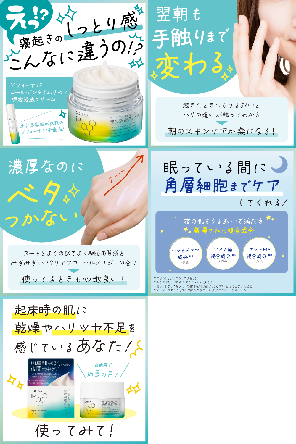 ①商品名:ソフィーナ iP ゴールデンタイムリペア 深夜浸透クリーム②訴求(何をしてくれるか):眠っている間に角層細胞までケア。