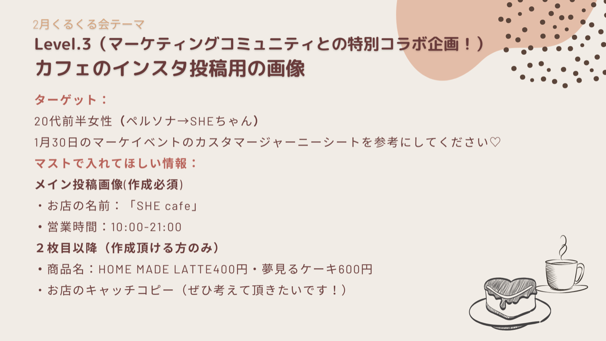 ペルソナは20代女性でキャリアスクールのキャラクター・SHEちゃん(オフィシャルイメージなどは明確ではありませんが、受講生の中では行動派で流行に敏感、おしゃれなイメージを持たれています。私の中ではギャルの印象です)。