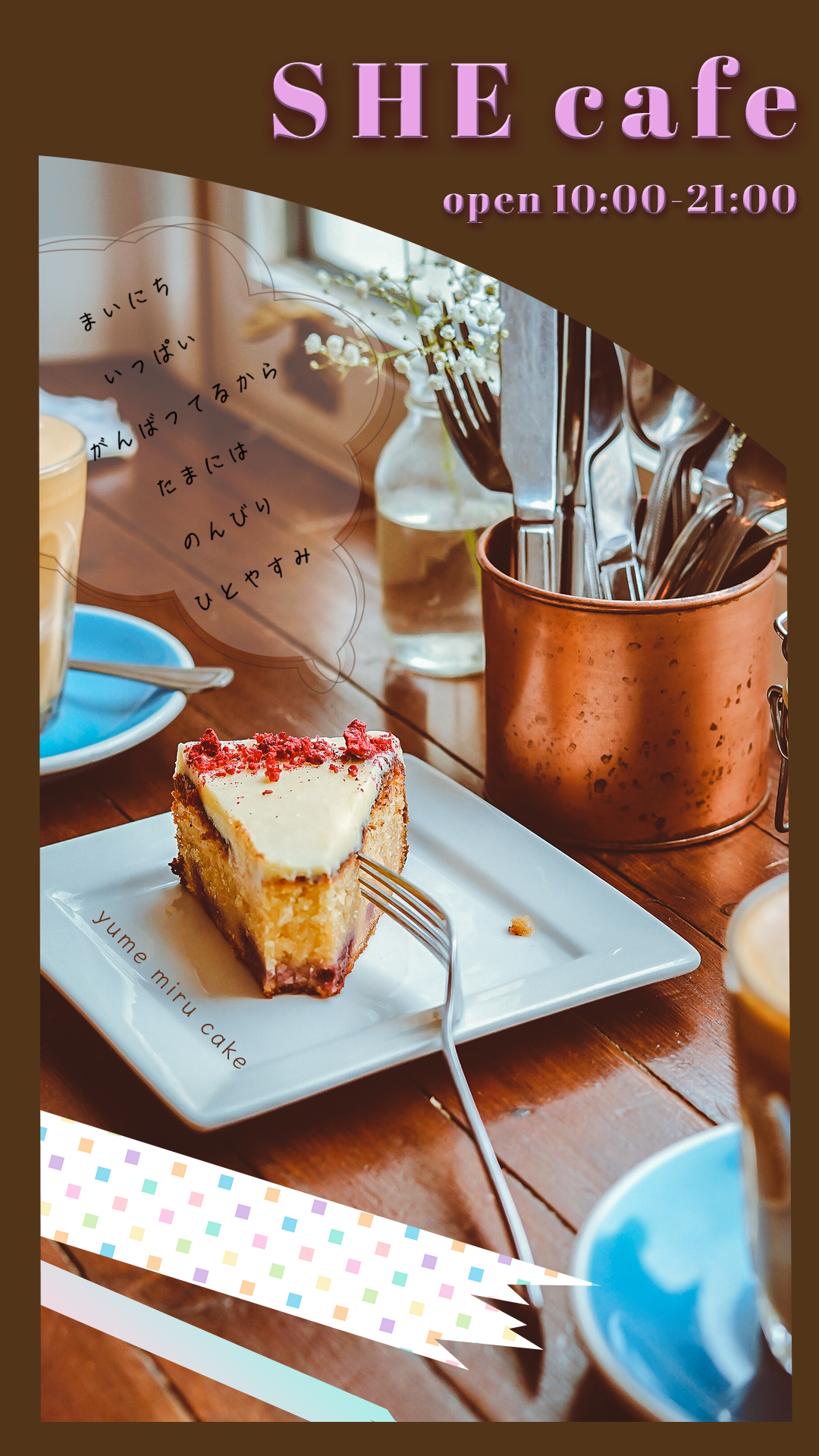 ケーキの色味が鮮やかなので、背景はあまりうるさくならないように意識しました。しかし、無地になるとのっぺりとした印象になってしまいおしゃれさとは程遠くなる感じ、カフェのイメージを取り入れられないかと考えました。その結果、木目の素材を使用することにしました。また、文字は視認性を高めるために白背景を入れました。