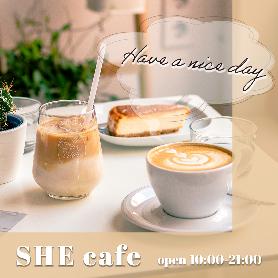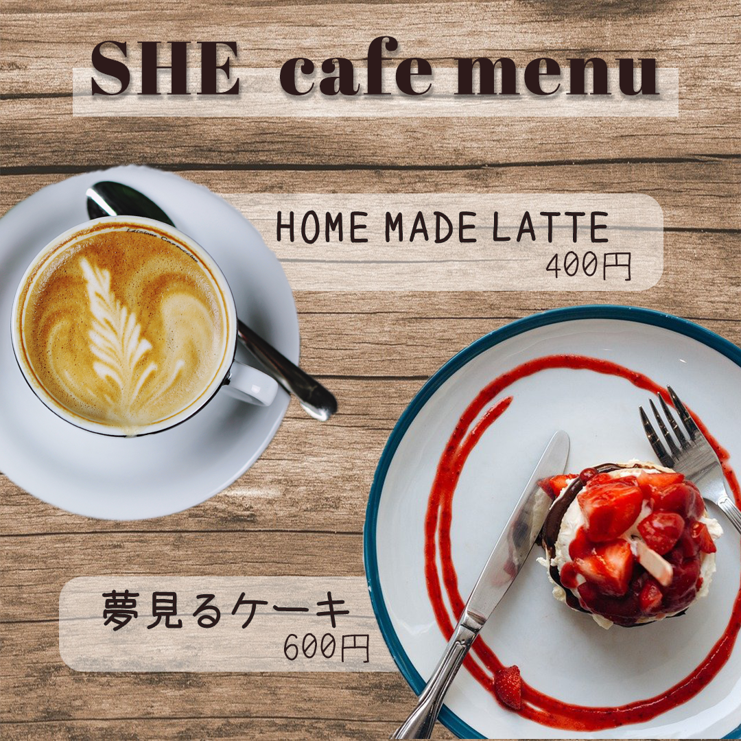 ・『SHE cafe』の文字間隔が狭く窮屈に感じる。広くしてゆったりとさせてみたらどうか。