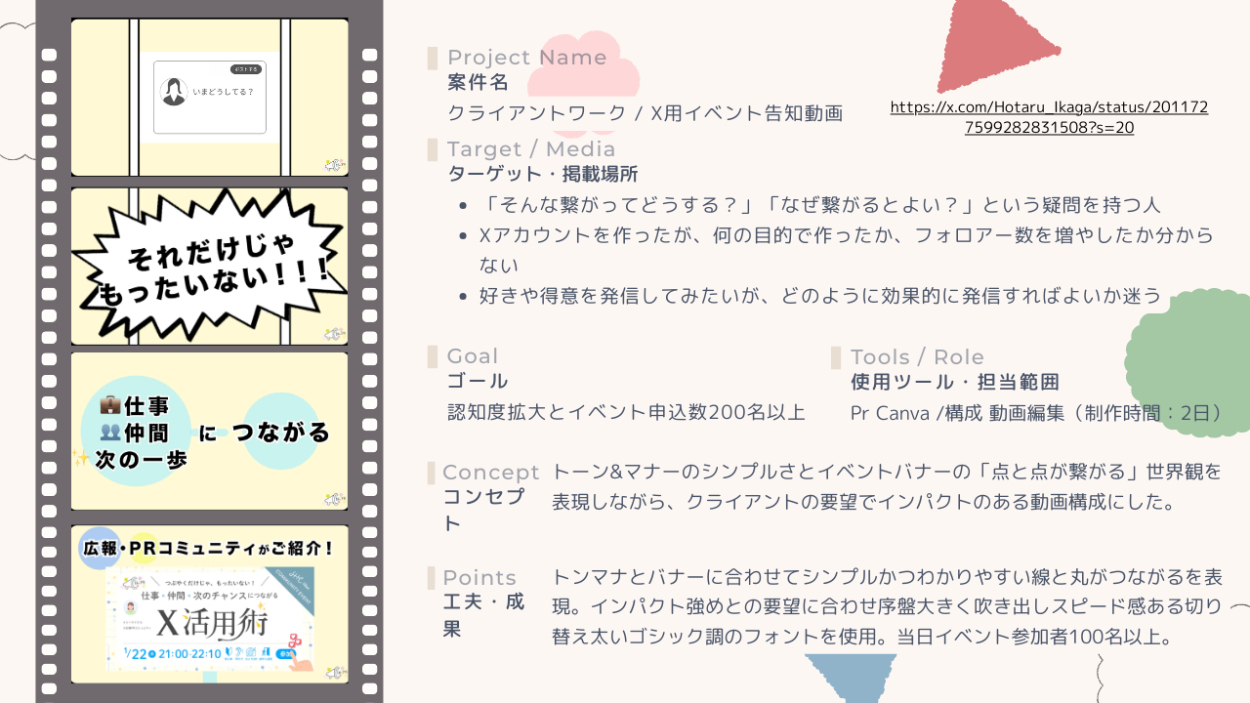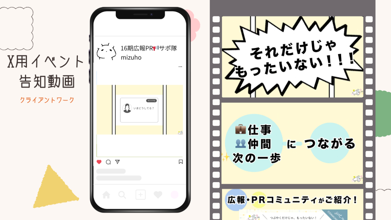 クライアントワーク / X投稿用イベント告知動画 MIZUhO “しなやかで自由”、でも“人とのつながりやバランスも大事に” OVERVIEW 16期広報PRコミュニティ様の1月公式イベントのX投稿用告知動画を作成しました。 2026/01 YEAR 2026 WEBSITE