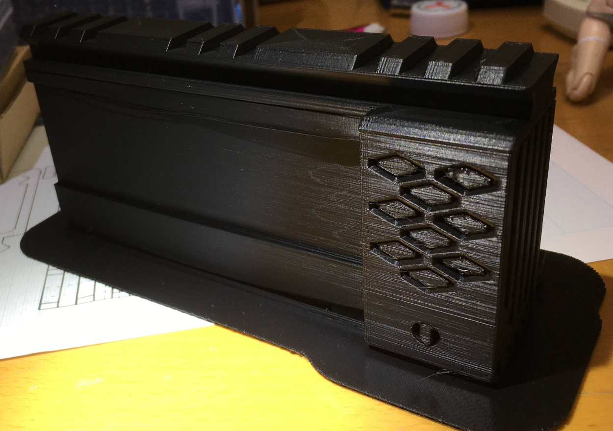 16時間半の出力が終わった後はバリ取りややすり掛けを行い、実際に銃本体に取り付けられるよう底面のレールにはめ合わせる部分や上部レールの細かなところを調整しました。