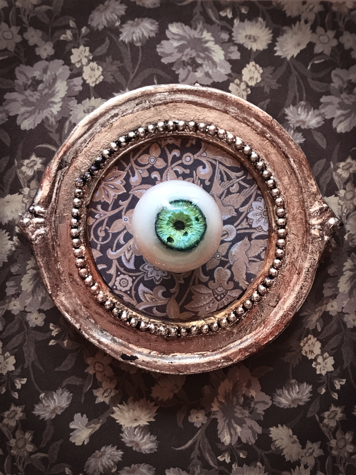 自主制作「瞳」 大石 学生 目玉作ってみたいな〜と思い、自己流で製作しました。粘土を丸め、虹彩は彫り込み式、アクリル絵の具で塗り、血管を付け、レジンでコーティングしました。額縁は、目の形を意識して製作しました。2026/01