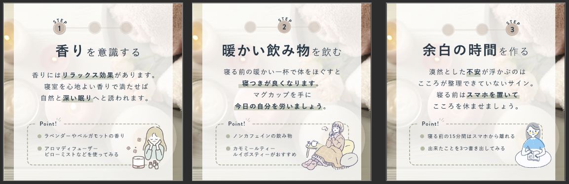 睡眠の質を整えるための「香り」をテーマに、Instagram投稿用画像を自主制作しました。