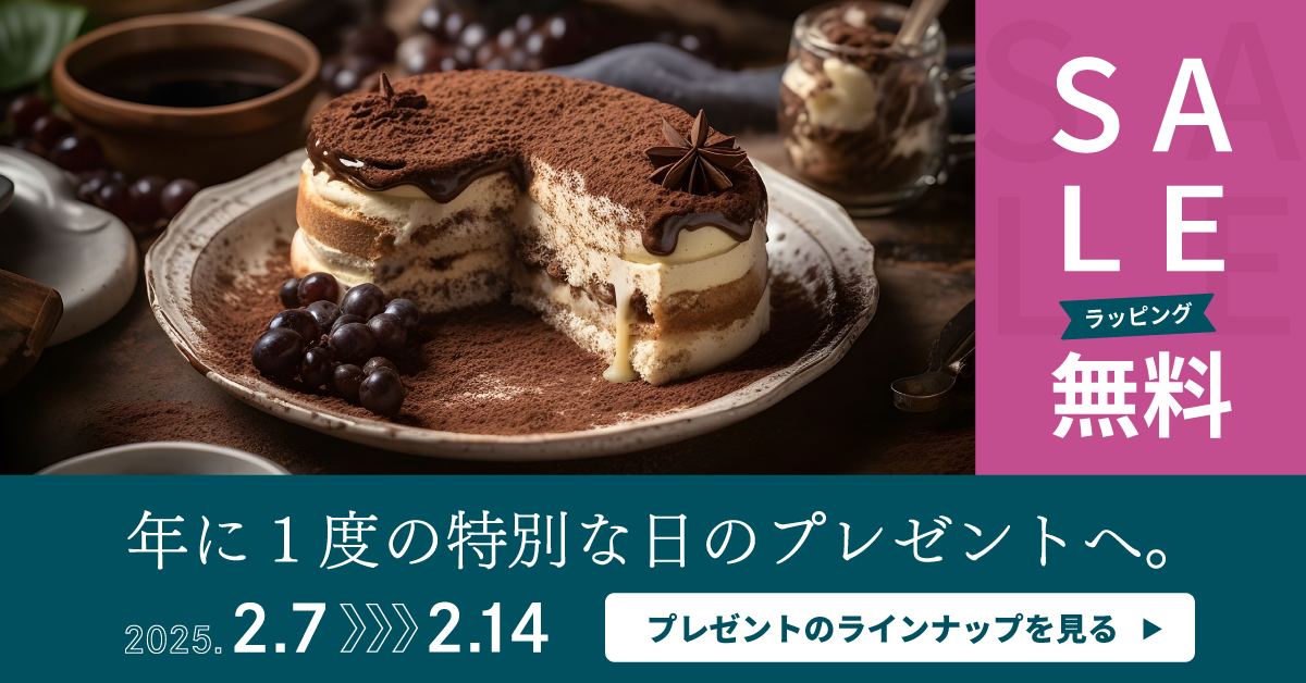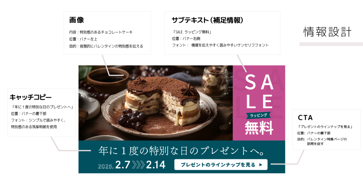 デザインのポイント:バレンタインの特別感を演出するために、画像は特別感のあるケーキを選び、フォントも上品で特別感のあるセリフフォントを使用。高級感を保ちつつも、「SALE」や「無料ラッピング」の補足情報を明確に伝えるために、目を引く背景デザインにし、特集ページへの流入を促進する工夫をしています。