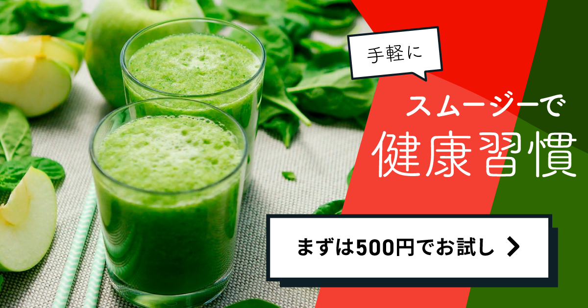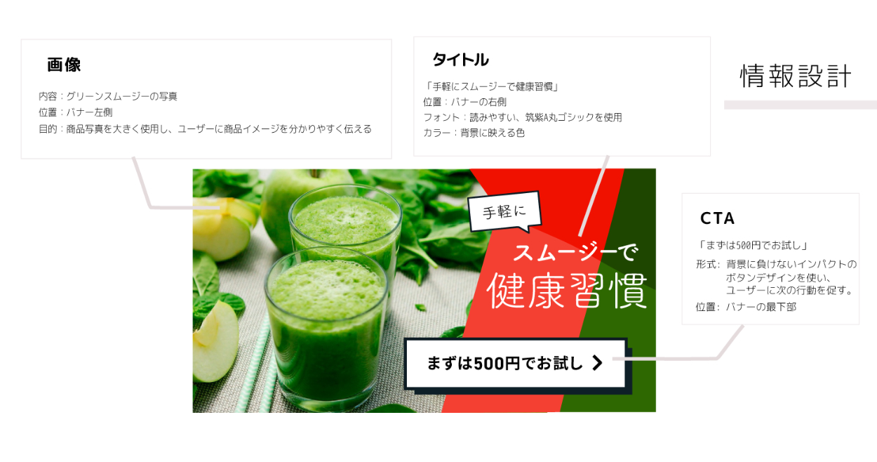 デザインのポイント:広告として目立つようにパッと目を引く配色を使用しました。スムージーを取り入れることで健康的かつ活動的な毎日を送れるイメージを、グリーンとオレンジの配色を使って表現。また、ボタンが一目でわかるように大きく配置し、派手なデザインに埋もれないよう、CTAの視認性を高めています。
