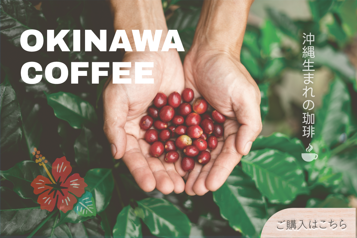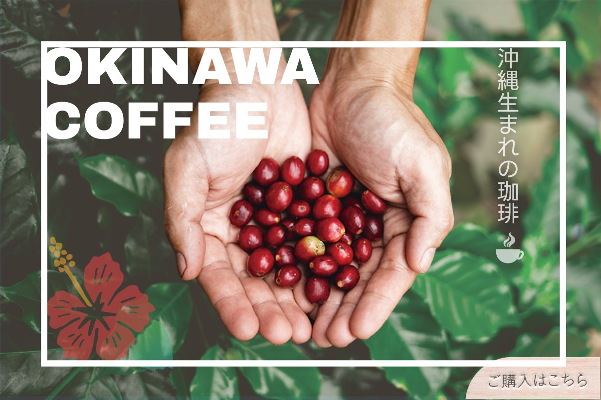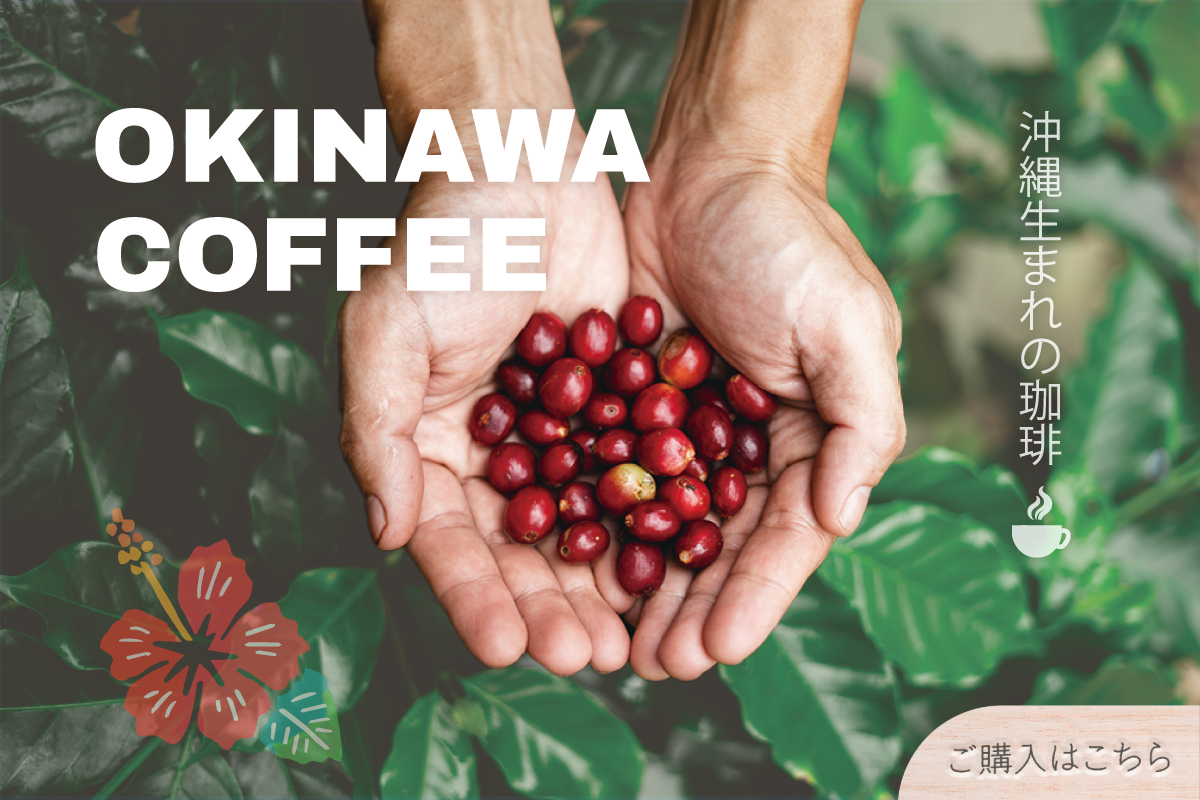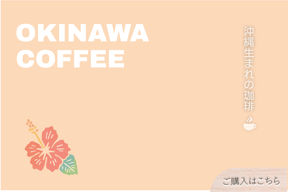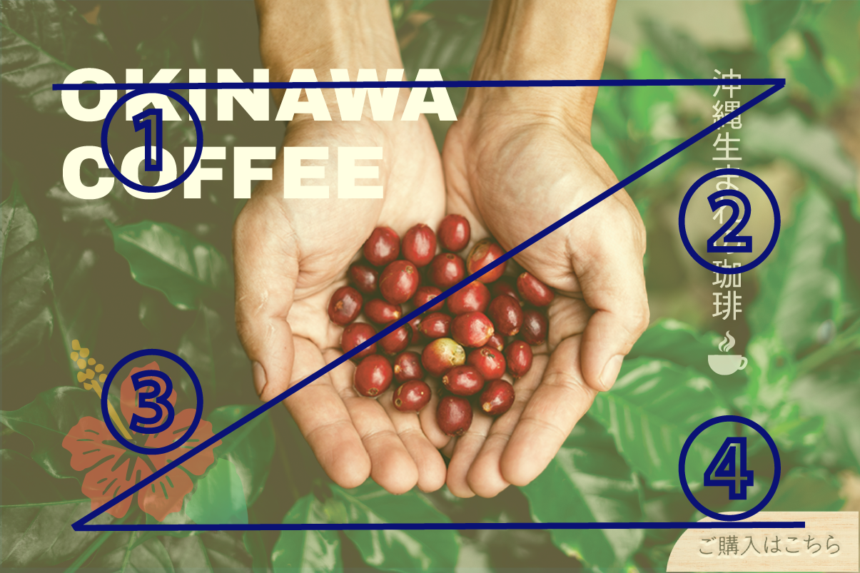 反映テキスト:①ブランド名「OKINAWA COFFEE」②サブテキスト「沖縄生まれの珈琲」③ブランドロゴ ④CVボタン「ご購入はこちら」