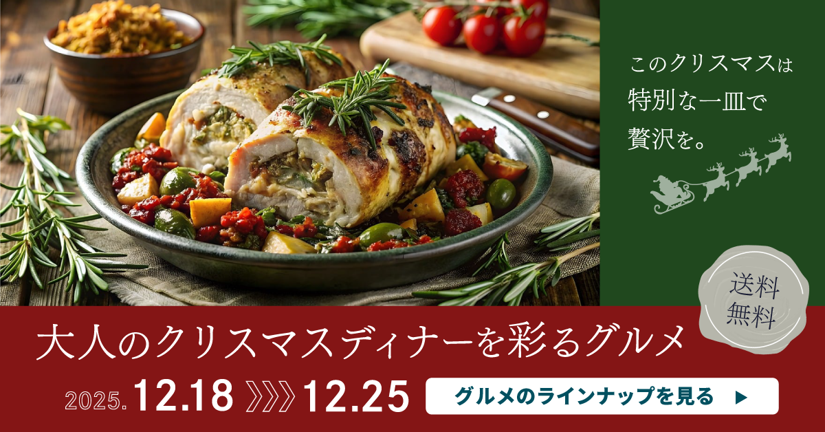 デザインのポイント:大人のクリスマスグルメの特別感を際立たせるため、クリスマスに合う華やかな雰囲気の料理コーディネートの写真を選定。全体の高級感を保てるようになデザインの「送料無料」という補足情報をボタンの近くに配置し、ユーザーの目線を特集ページのボタン引きつけ、特集ページへの流入を促進する工夫をしています。