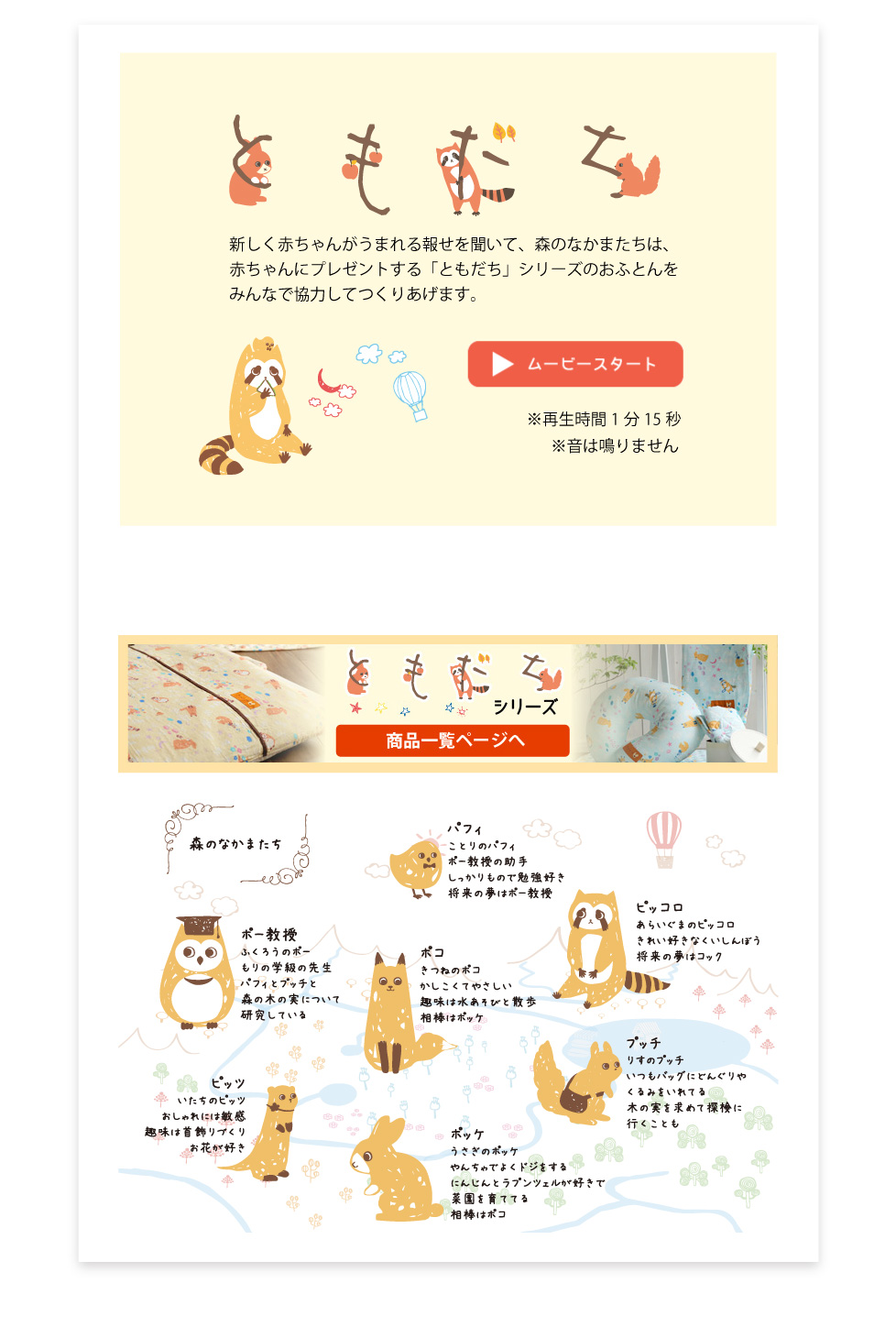 オリジナルキャラクターたちをモチーフにした布団セット、キャラクターや世界観は、布団のデザイナーの方が全て生みだされ、カタログ用に、お布団をみんなで作る絵本も作成されました。