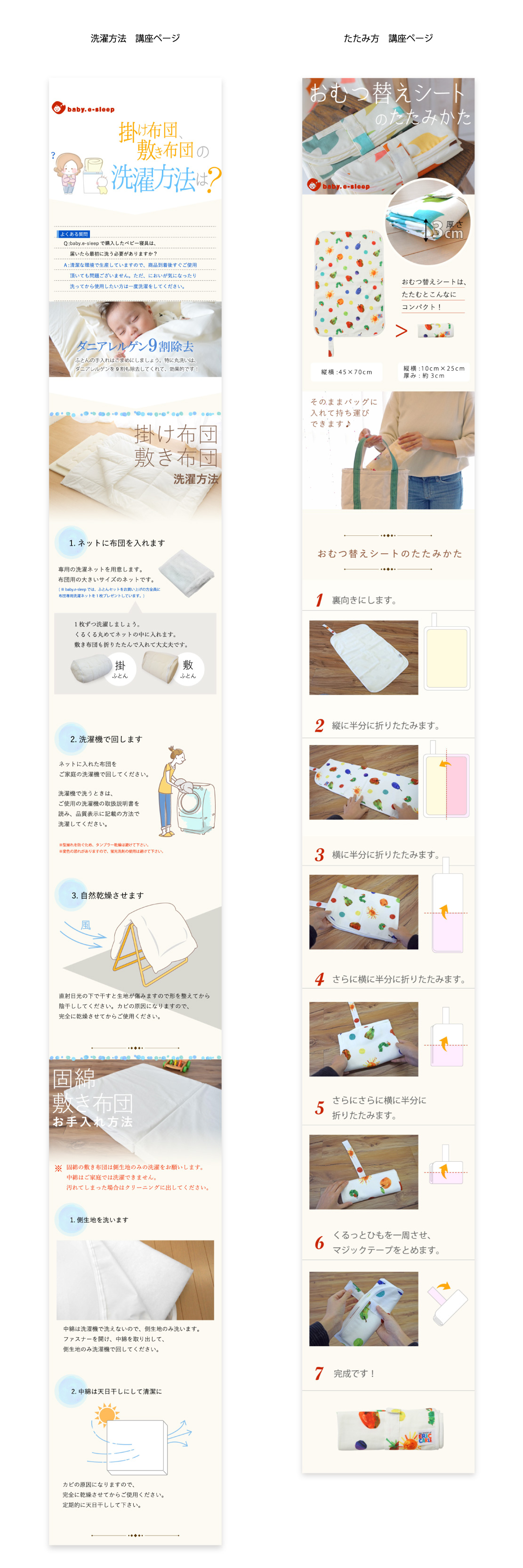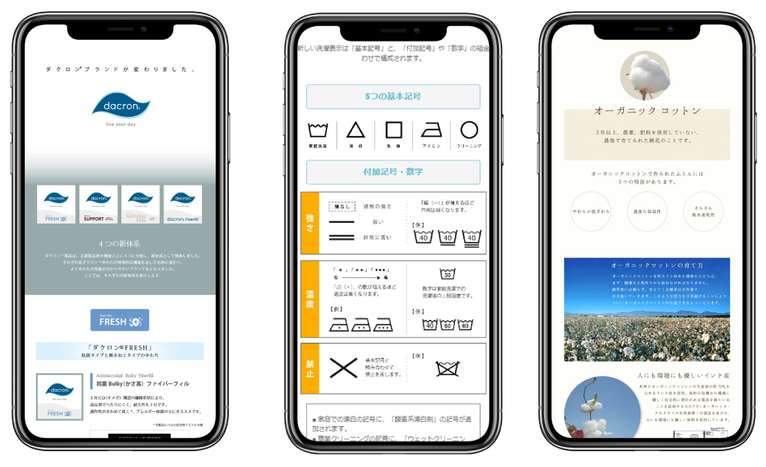 布団の綿に使われているこだわりの素材や、タグに書かれている表記の意味を説明するページを制作しました。